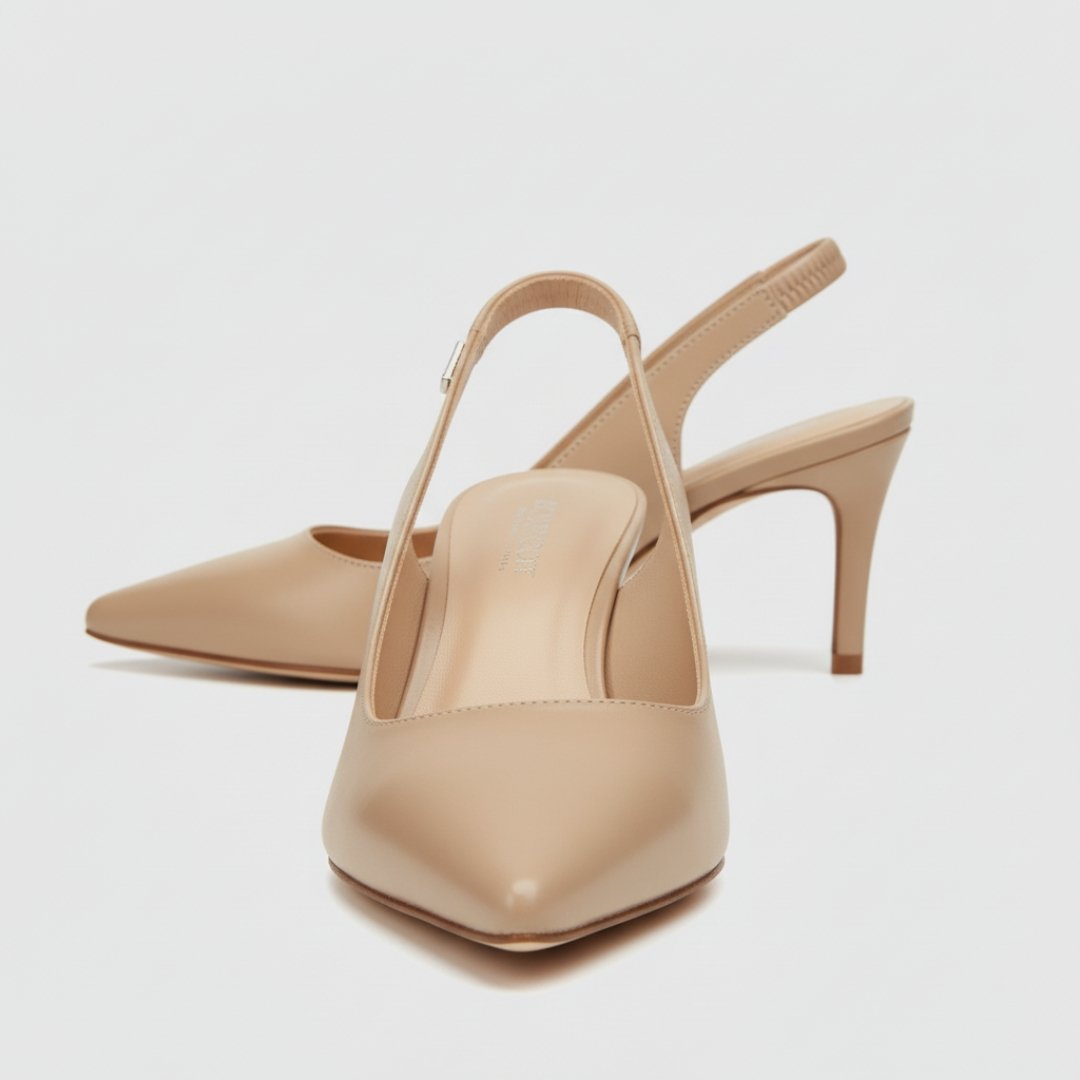 De delicate slingback-band met metalen detail en de slanke hak creëren een silhouet dat even krachtig als vrouwelijk is.