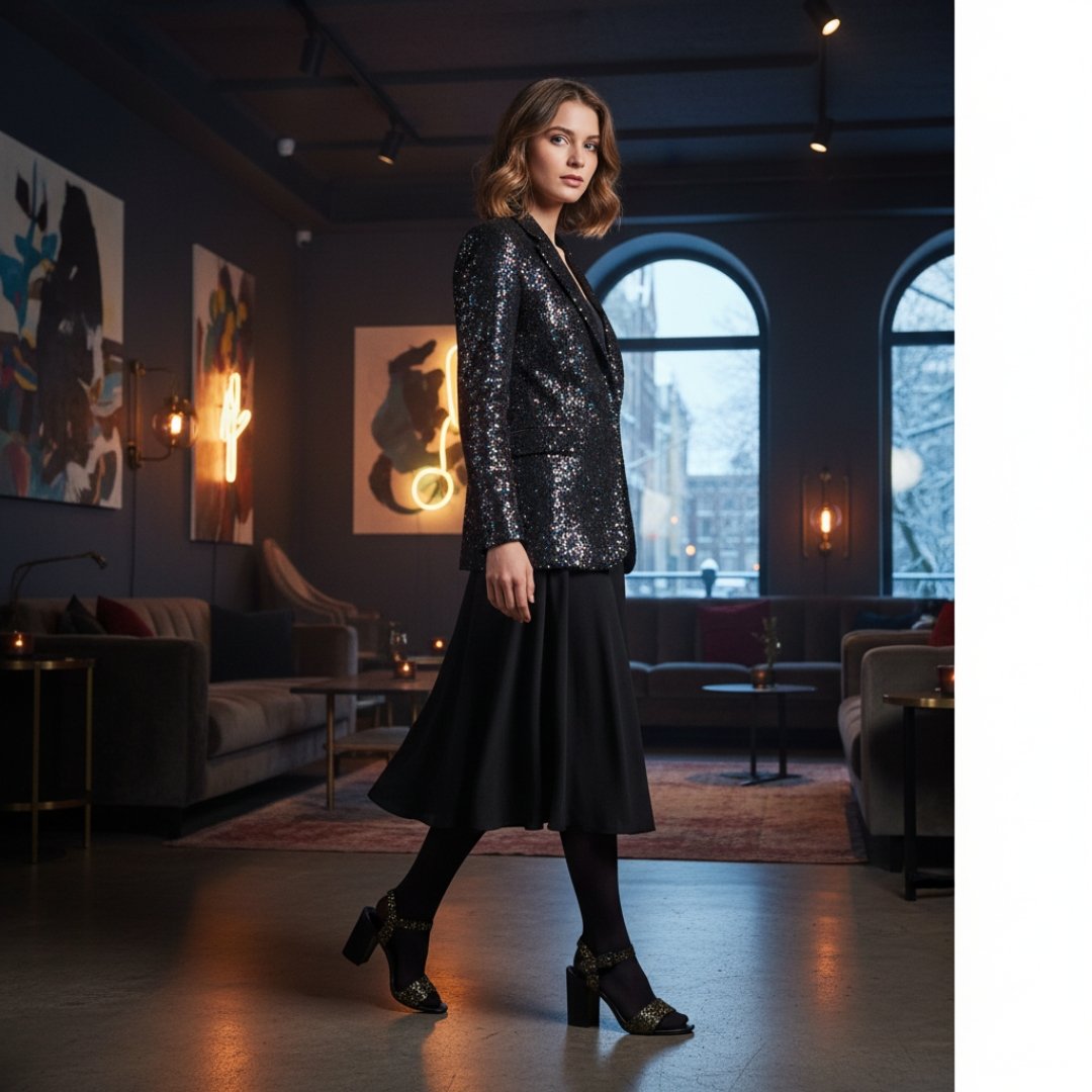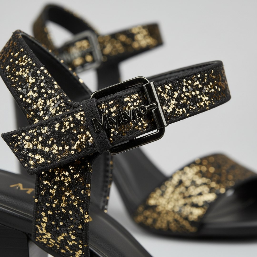 Ontdek de Midnight Starburst sandalen van Mylvro, ontworpen om pure glamour uit te stralen. Deze sandalen zijn ideaal voor indoor feesten, winterse events en speciale avonden waar u wilt schitteren. De sprankelende gouden glitterdetails en de stabiele blokhak zorgen voor zowel stijl als comfort—perfect om de hele avond moeiteloos te dansen.